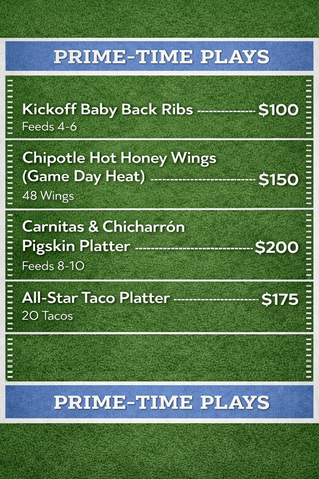 Celebrate Super Bowl Sunday with Alta Calidad’s game-day spreads, built for sharing and perfect for feeding a crowd. From baby back ribs and chipotle hot honey wings to taco platters, house-made sides, and classic desserts, our pre-order packages are designed for 8–10 guests and make hosting effortless. Pre-orders open soon, with limited availability for game day.